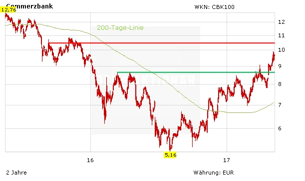 Die Aktie der Commerzbank gehört zu den besten Werten des DAX im laufenden Jahr. Seit Jahresbeginn liegt die Notierung bereits 34 Prozent im Plus. Der Leitindex schaffte bisher nur 12 Prozent. Die Marke von 10,00 Euro kann bereits diese Woche fallen. DER AKTIONÄR erklärt, was Anleger dann erwartet.