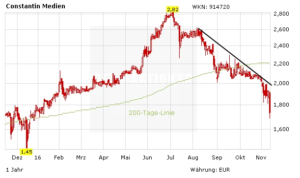 Wegen diesen Vorfällen droht nun ein gerichtliches Verfahren. Möglicherweise muss erneut eine Hauptversammlung stattfinden. Diese Unsicherheit belastet die Papiere von Constantin Medien massiv. Am Tag nach der zweiten Hauptversammlung dieses Jahres brach die Aktie um rund acht Prozent ein und rutscht unter den Stopp bei 1,85 Euro.