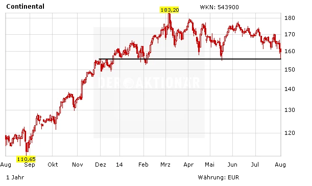 Am Donnerstag hat Continental erneut seine Jahresprognose erhöht. Die Analysten zeigen sich dennoch nicht zufrieden mit den veröffentlichten Daten. Manche Segmente haben laut den Experten zu enttäuschend abgeschnitten. Die Aktie nähert sich im schwachen Gesamtmarkt dem wichtigen Unterstützungskorridor zwischen 155 und 158 Euro.