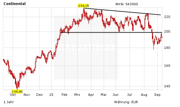 „Neben der für die Sommermonate typischen saisonalen Abschwächung sehen wir aktuell ein stabiles Umfeld auf dem guten Niveau des ersten Halbjahres“, ergänzte Finanzchef Wolfgang Schäfer. Die bekannten Probleme bleiben allerdings bestehen. So lassen zum einen der Rückenwind durch niedrige Preise für Rohstoffe wie Öl und Kautschuk langsam nach. Zum anderen nähere sich der Geschäftszyklus in der globalen Autoindustrie dem Ende, schrieb Analyst Stuart Pearson in einer Branchenstudie vom Donnerstag. Was in China begonnen habe, sollte sich im Bereich der Nordamerikanischen Freihandelszone (Nafta) fortsetzen. Dank des widerstandsfähigen und profitablen Reifengeschäfts sei Continental jedoch einer der defensivsten Titel in der Branche. Pearson senkte sein Kursziel von 247 auf 225 Euro und beließ die Einstufung auf „Neutral“.