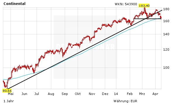 Charttechnisch betrachtet hat die Conti-Aktie die Aufwärtstrendlinie bereits gebrochen. Eine wichtige Unterstützung befindet sich im Bereich der 90-Tage-Linie bei 161,90 Euro.