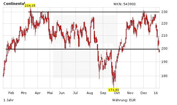 Nach den Zahlen zum abgelaufenen Geschäftsjahr hat sich die Lage bei der Continental-Aktie nicht entscheidend verändert. Nach wie vor kämpft der DAX-Titel mit der 200-Euro-Marke. Dort verläuft die untere Begrenzung des seit rund einem Jahr intakten Seitwärtskorridors.