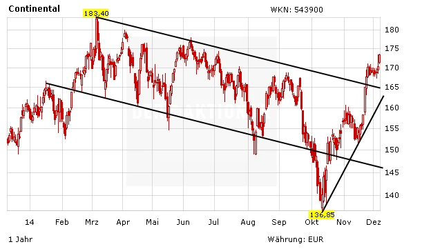 Die Konsolidierung bei der Continental-Aktie scheint beendet zu sein. Seit dem Tief unter 140 Euro im Oktober hat sich der DAX-Titel rapide erholt. Rund 25 Prozent Plus stehen seitdem bereits zu Buche. Mit dem Überwinden des mittelfristigen Abwärtstrends ist zudem eine wichtige charttechnische Hürde geknackt worden.