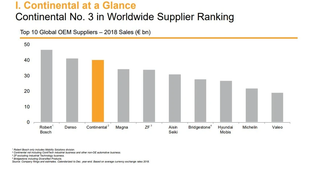 Weltweit ist Continental derzeit die Nummer 3 im Automobilzulieferer-Geschäft, hinter Bosch und dem japanischen Elektrik-Spezialisten Denso. Im vergangenen Jahr erwirtschaftete das Unternehmen im Zulieferer-Bereich einen Umsatz von rund 44,4 Milliarden Euro.