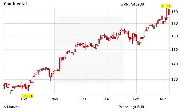 Continental ist einer der besten Werte am deutschen Aktienmarkt. Der Aufwärtstrend ist weiterhin intakt. Mit den zuletzt starken Zahlen und dem optimistischen Ausblick im Rücken dürften bald neue Höchstkurse möglich sein. Der Stopp sollte zur Absicherung bei 145 Euro platziert werden. Auch die Belegschaft kann sich über Rekorde freuen. Für das Jahr 2013 mit seinen neuen bilanziellen Bestmarken belohnt Conti seine Belegschaft mit insgesamt 120 Millionen Euro. Diese Erfolgsbeteiligung sei nach 100 Millionen Euro für 2012 ein neuer Höchststand, teilte der Konzern am Samstag mit.