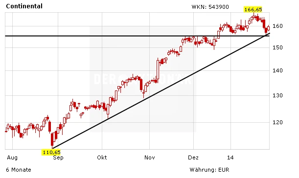Continental setzt seinen Aufwärtstrend weiter fort. Die Conti-Aktie gehört auf Jahressicht mit 90 Prozent Plus zu den Top-Performern im DAX. Durch positive Analystenstimmen nimmt die Aktie am Dienstag, nach einer kurzen Verschnaufpause, wieder Schwung auf.