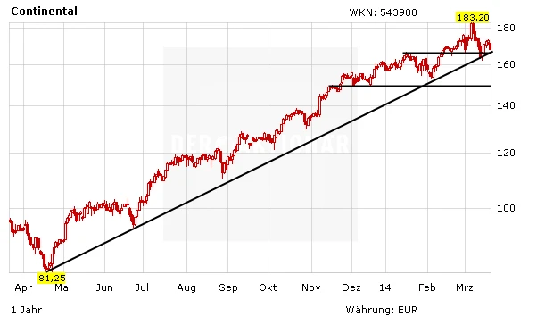 Langfristig bleibt Continental ein absolutes Top-Investment. Der DAX-Titel ist einer der besten Werte am deutschen Aktienmarkt. Zudem ist der langfristige Aufwärtstrend noch intakt. Ebenfalls positiv stimmt der Ausblick des Konzerns für das laufende Jahr. Sollte sich die derzeitige Korrektur jedoch vorerst fortsetzen, sollten Anleger den Stopp bei 145 Euro beachten.