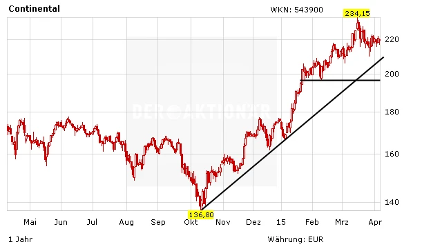 Nach der Rallye zu Beginn des Jahres konsolidiert die Continental-Aktie derzeit auf hohem Niveau. Im Bereich der 220-Euro-Marke notiert der DAX-Titel nach wie vor knapp oberhalb des intakten Aufwärtstrends. Am Mittwoch belastet den Autozulieferer jedoch eine Verkaufsempfehlung von Kepler Cheuvreux.