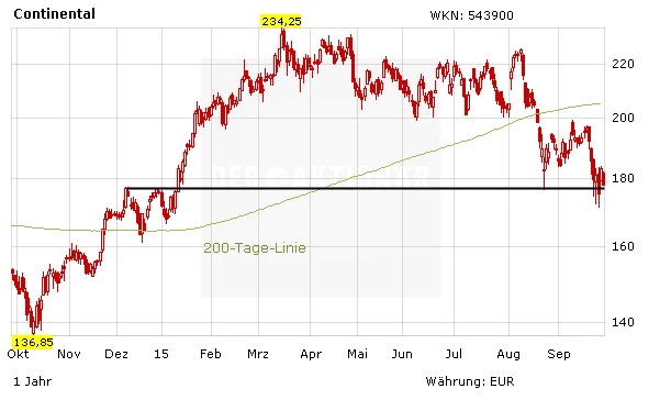 Vom Jahreshoch bei 234,25 Euro hat die Continental-Aktie nur rund 25 Prozent eingebüßt. Zum Vergleich: ElringKlinger (minus 47 Prozent), Grammer ( minus 50 Prozent) und Leoni (minus 35 Prozent) kamen deutlicher unter die Räder. Analyst David Lesne von der Schweizer Großbank UBS hat die Einstufung für Continental nach einem China-Besuch auf "Buy" mit dem Kursziel von 235 Euro je Aktie belassen. Viele der besuchten Autobauer und Zulieferer rechneten mit einer Nachfrageerholung in China im vierten Quartal, schrieb Lesne in einer Branchenstudie. Der Preiswettbewerb und der Kostenanpassungsdruck stellten die Anbieter aber weiter vor Herausforderungen. Das Wartungsgeschäft wachse weiter stark und verlagere sich zunehmend auf die Zulieferer. Continental bleibe mit dem französischen Zulieferer Valeo und GKN sein Branchenfavorit.