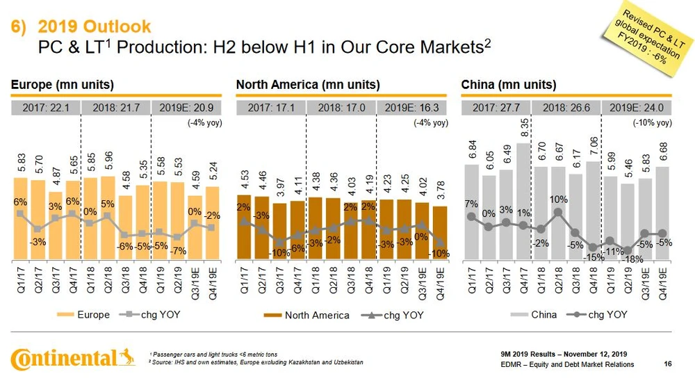 Vorstandschef Elmar Degenhart sprach angesichts der heiklen Lage der Branche von einer vergleichsweise soliden Entwicklung - "trotz des weiterhin rückläufigen Marktumfeldes". Die Anzeichen deuten aber auf schwierige Zeiten: "In den kommenden fünf Jahren rechnen wir ähnlich wie andere Marktteilnehmer nicht damit, dass sich die weltweite Produktion wesentlich beleben wird", so Finanzchef Schäfer. Im dritten Quartal nahm sie bei Pkw und leichten Nutzfahrzeugen um drei Prozent ab, aufs Gesamtjahr gesehen dürften es minus sechs Prozent sein.