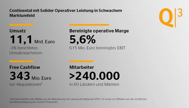 Dadurch, dass Conti frühzeitig etwa bei Sensorik und E-Antrieben ein breites Geschäft aufbaute, kann der Konzern den Wandel bisher relativ gut abfedern. "Betrachtet man unsere rein operative Leistung, haben wir uns im dritten Quartal vernünftig entwickelt", meinte Schäfer.