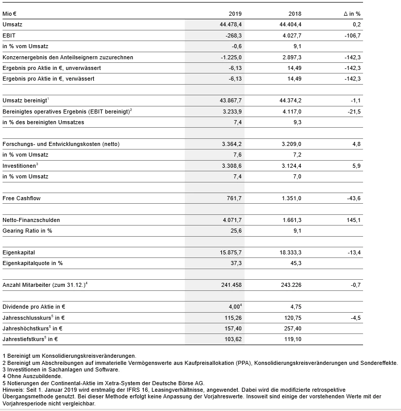 Continental konnte den Umsatz um 0,2 Prozent auf 44,5 Milliarden Euro steigern. Unterm Strich fiel ein Verlust je Aktie von minus 6,1 Euro an (2018: 14,49 Euro). Die Dividende wird von 4,75 Euro auf vier Euro gesenkt.