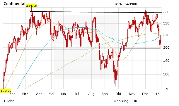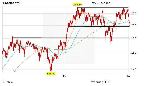 Die Geschäfte von Conti laufen nach wie vor gut. Jedoch kann sich auch die Aktie des Autozulieferers dem schwachen Gesamtmarkt nicht entziehen. Technisch ist das Papier angeschlagen. Es ist durchaus möglich, dass die Aktie bis 180 Euro zurück fällt. Auf diesem Niveau sollten Anleger ein erstes Kauf- beziehungsweise Nachkauflimit platzieren.