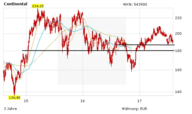 Mehrmals konnte in den letzten Wochen die Marke von 200 Euro nicht nachhaltig überwunden werden. Die Aktie kämpft aktuell mit der wichtigen 200-Tage-Linie. Continental wird sicherlich einer der wichtigsten Player und Zulieferer im Markt für selbst fahrende Autos sowie für die Elektromobilität. Allerdings werden dafür andere Geschäftsfelder wegfallen. Das Reifengeschäft ist und bleibt eine solide Basis für Conti. Anleger können eine erste Position um 186,30 Euro wagen. Hier liegt eine starke Unterstützung. Eine zweite starke Unterstützung aus den letzten Jahren liegt bei 180,00 Euro. Hier kann ein weiteres Kauflimit platziert werden.