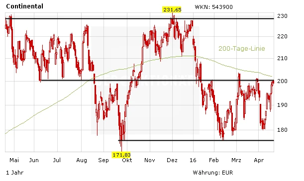 Seit über einem Jahr steckt die Continental-Aktie in einem breiten Seitwärtstrend fest. Der DAX-Titel pendelte dabei zwischen 175 und 230 Euro. In der Mitte dieses Korridors verläuft zudem die wichtige 200-Euro-Marke, an der die Aktie zuletzt mehrfach gedreht hat. Gelingt nun der Sprung über diesen Widerstand, sollte auch die 200-Tage-Linie (GD200) überwunden werden. Der Weg nach oben wäre dann frei.
