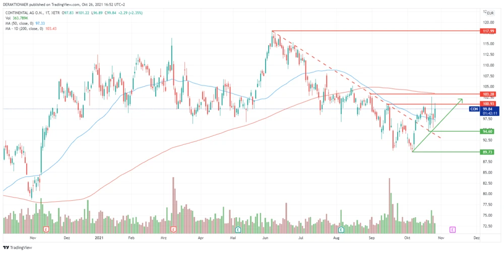 Als Automobilzulieferer hat auch Continental mit den anhaltenden Lieferengpässen zu kämpfen. Diese Sorgen sind allerdings nicht neu und so scheint vieles bereits in der Aktie eingepreist zu sein. Die Kursentwicklung ist seit Jahresbeginn nämlich bescheiden, das 52-Wochen-Hoch wurde im Juni bei 118 Euro markiert. Ein neues Jahrestief erreichte der Titel Anfang Oktober bei 89,73 Euro.
