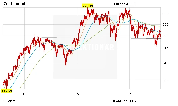 Getrieben vom starken Reifengeschäft hat Continental seine Prognose für 2016 abermals erhöht. Und dennoch geht die Aktie in die Knie. Der Umsatz wuchs im zweiten Quartal um 1,6 Prozent auf 10,2 Milliarden Euro. Der Gewinn vor Zinsen und Steuern stieg um knapp sechs Prozent auf 1,25 Milliarden Euro. Insgesamt rechnet Conti damit, das bisherige Ziel im Gesamtjahr für die um Sondereffekte bereinigte operative Marge (bereinigte Ebit-Marge) von 11 Prozent nun übertreffen zu können.