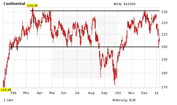 Am Montag wird Continental die Eckdaten der Jahreszahlen für 2015 vorlegen. Dann dürfte sich zeigen, in welche Richtung sich der DAX-Titel in den kommenden Wochen bewegen wird. Am Donnerstag war die Aktie des Automobilzulieferers und Reifenherstellers aufgrund der Turbulenzen in China noch erstmals seit Oktober unter die 200-Euro-Marke gefallen, im Anschluss hatte sie sich aber wieder etwas erholt.