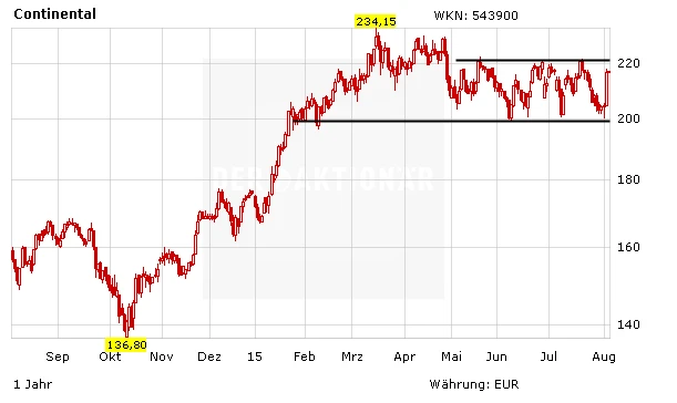 Bei Continental geht der Blick der Anleger wieder nach oben. Seit dem Hoch im März hat sich die Aktie des Reifenherstellers und Autozulieferers seitwärts bewegt. Nach starken Zahlen zum zweiten Quartal konnte der DAX-Titel am gestrigen Dienstag allerdings deutlich zulegen. In einer ersten Einschätzung zeigen sich auch die Analysten zufrieden mit den vorgelegten Daten.