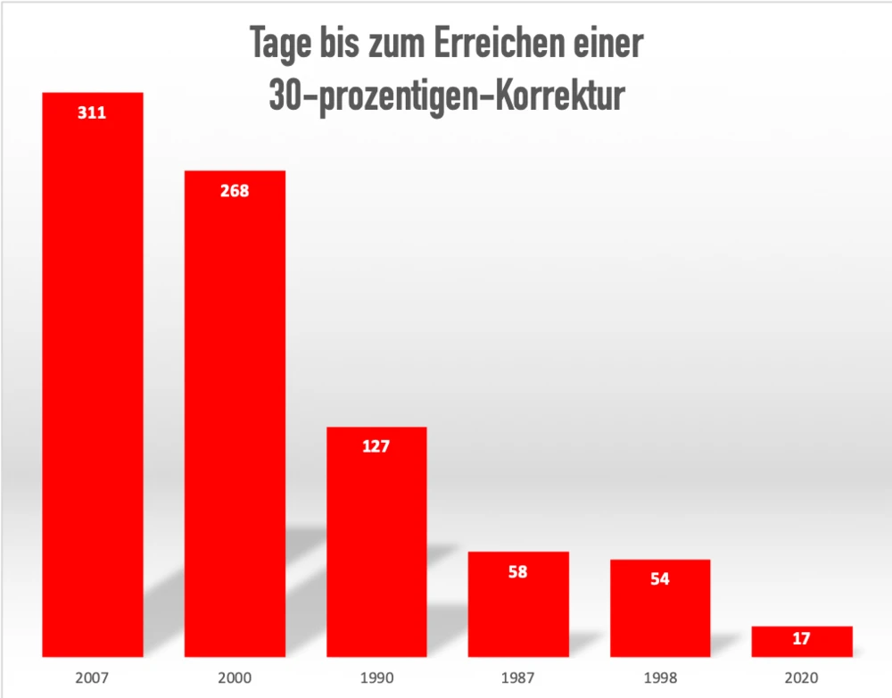 Solange der Handel weiterläuft, müssen sich Anleger auf unverändert hohe Schwankungen einrichten. Am Donnerstag erlitt der DAX den höchsten Ein-Tages-Verlust seiner Historie. Das deutsche Börsenbarometer verlor im Laufe der Sitzung über zwölf Prozent. Die Wegstrecke von Allzeithoch (auf Schlusskursbasis) bis zum Erreichen einer 30-prozentigen-Korrektur legte der DAX innerhalb von nur 17 Handelstagen zurück und damit so schnell wie nie zuvor. Im Zuge der Weltfinanzkrise, die ihren Höhepunkt in der Pleite der US-Investmentbank Lehman Brothers fand, betrug die Zeitspanne noch 311 Tage. Beim Platzen der Dotcom-Blase lagen zwischen Allzeithoch und Erreichen einer 30-prozentigen-Korrektur 268 Tage.