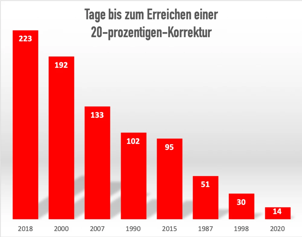 Lehman Brothers, Dotcom-Blase, 1987 – wenn Anleger an einen Börsenkrach denken, dann zumeist an einen der genannten. Bisweilen wird auch die Große Depression der 20er-Jahre des vorangegangenen Jahrhunderts rezitiert, um an die dunklen Seiten des Börsengeschehens zu erinnern. Damals, am Black Thursday, verkauften alle Investoren gleichzeitig ihre Wertpapiere. Es sollte drei Jahre dauern, bis der Dow Jones seinen Tiefpunkt erreichte. Jetzt zeigt sich: Der Corona-Crash nimmt zumindest mit Blick auf den deutschen Aktienmarkt eine unrühmliche Rolle in dieser Reihe schwerer Kurseinbrüche ein. Der Corona-Crash ist ein Turbo-Crash. Nie zuvor in der Geschichte brachen die Kurse so schnell so stark ein wie zuletzt.