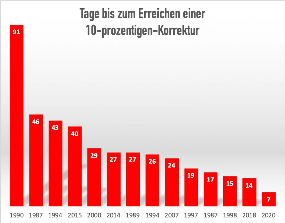 Das Platzen der Dotcom-Blase um die Jahrtausendwende bedeutete den bis dato größten Kurseinbruch am deutschen Aktienmarkt. Der DAX verlor ausgehend vom Hoch im Jahr 2000 bis zum Korrekturtief am 12. März 2003 mehr als zwei Drittel an Wert. Exakt 72,7 Prozent betrug das Minus, ehe der Markt wieder gen Norden drehte. Für den in dieser Statistik nach 10- und 20-Prozent-Korrektur nächsten relevanten Punkt eines Abschlags um 30 Prozent benötigte der Markt seinerzeit dennoch überdurchschnittlich lang: Ganze 268 Tage dauerte es, bis der Indexwert um ein knappes Drittel gesunken war. Sowohl 1987 als auch 1998 (Russlandkrise) ging es mit Zeiträumen von 58 respektive 54 Handelstagen deutlich schneller. Dennoch: Auch hier markiert der Corona-Crash einen einsamen Spitzenwert. 17 Handelstage haben gereicht, um ein Drittel des Indexwertes verschwinden zu lassen.
