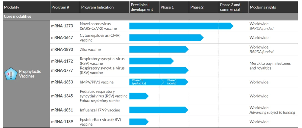 Der derzeit wohl wichtigste Pipeline-Bestandteil der Biotech-Schmide, die auf einen mRNA-Ansatz setzt, ist das Corona-Impfstoff-Programm. Der Hoffnungsträger mRNA-1273 befindet sich inzwischen in der entscheidenden Phase der klinischen Entwicklung.