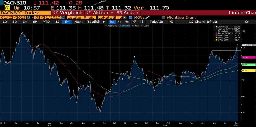 Gut möglich, dass die in China beheimateten Biotech- und Pharma-Aktien bei einer Ausbreitung vom Coronavirus weiter zulegen können. Mutige Anleger können daher eine Position auf den AKTIONÄR China Biotech Index eingehen, der vor Kurzem auf ein neues 52-Wochen-Hoch gestiegen ist.