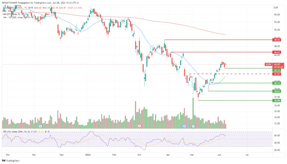 Aus technischer Sicht hat die Covestro-Aktie mit dem Ausbruch über den Widerstand bei rund 42 Euro einen neuen Aufwärstrend eingeleitet. Zugleich hat sich der Titel vom Jahrestief bei 36,88 Euro in vier Wochen um fast 20 Prozent erholt – ein starkes Zeichen der Bullen. Gestützt wird der Rebound von den Support-Leveln bei 43,12 sowie bei 40,14 und 38,62 Euro.