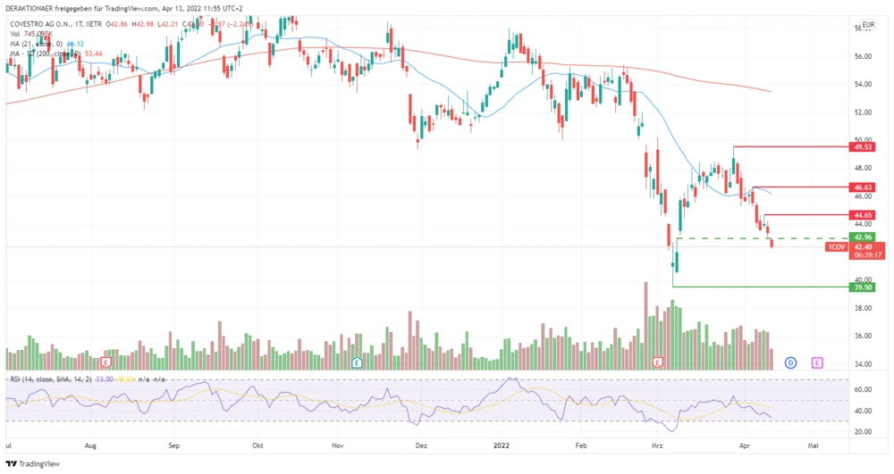 Kommt es zum Energieengpass, wird es bei der Covestro-Aktie wahrscheinlich erneut ungemütlich werden. Gibt es keine Einschnitte, ist die Bewertung günstig und die Dividendenrendite von 7,7 Prozent stattlich. Mutige Anleger beachten daher den Stopp bei 34 Euro.