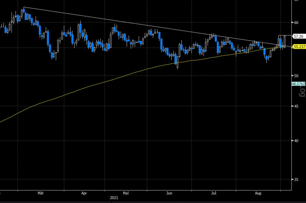 Durch den heutigen Kurssprung hellt sich das Chartbild weiter auf. So glückte nun erneut der Ausbruch aus dem zuvor seit März intakten Abwärtstrend. Hält sich der Kurs nun oberhalb der Trendlinie, könnte dies Anschlusskäufe nach sich ziehen. Zunächst wäre es nun wichtig, dass auch das Zwischenhoch bei 57,40 Euro genommen wird. Dann wäre der Weg nach oben vorerst frei.