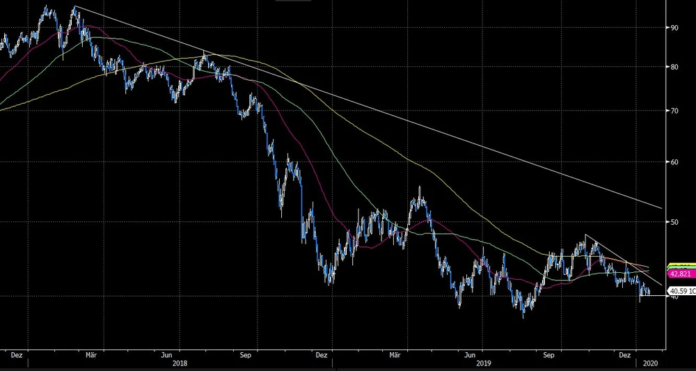 Dementsprechend trüb sieht derzeit auch das Chartbild aus. Der DAX-Titel befindet sich in einem Abwärtstrend. Wird die Unterstützung im Bereich von 40 Euro bald auch noch unterschritten, droht ein Test des 52-Wochen-Tiefs bei 37,30 Euro.