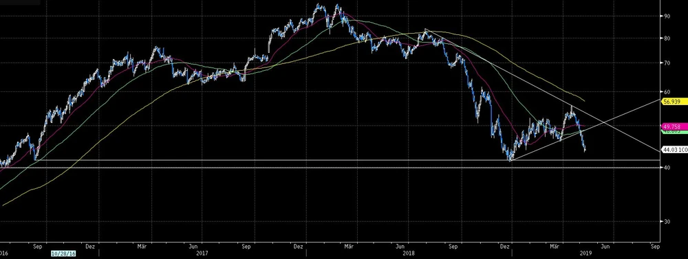 Auch das Chartbild hat sich zuletzt wieder deutlich eingetrübt. So scheiterte zunächst ein Ausbruchsversuch aus dem Abwärtstrend. Zudem wurde der kurzfristige Aufwärtstrend gebrochen. Nun wird es spannend, ob die beiden Unterstützungen bei 41,20 und 40,00 Euro verteidigt werden können.