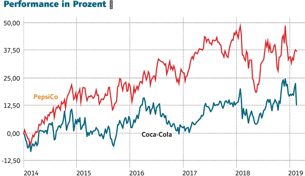 Noch gravierender ist der Unterschied seit 2014: Coca-Cola kommt auf ein Kursplus von nur 12,5 Prozent, PepsiCo auf 37 Prozent.