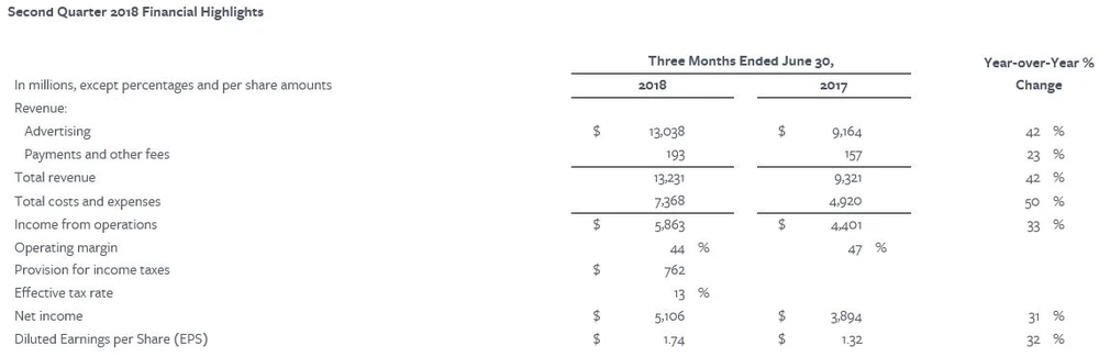 Die Zahlen im Detail: Der Umsatz stieg im zweiten Quartal dank des boomenden Geschäfts mit Online-Werbung im Jahresvergleich zwar um 42 Prozent auf 13,23 Milliarden Dollar. Analysten hatten im Vorfeld allerdings einen Zuwachs auf 13,36 Milliarden Dollar erwartet. Der Gewinn kletterte um 31 Prozent auf 5,1 Milliarden Dollar. Immerhin der Gewinn je Aktie konnte mit 1,74 Dollar die Prognosen von 1,72 Dollar leicht übertreffen.
