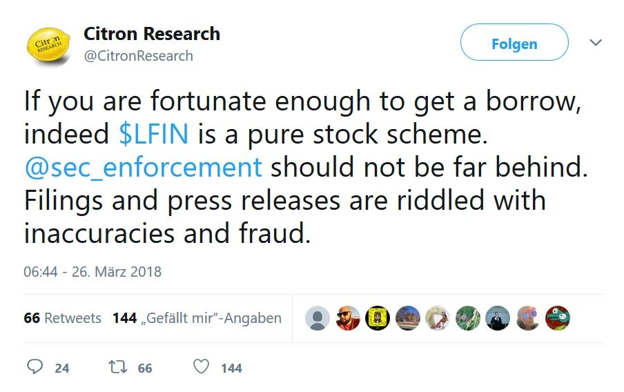 Am Montagabend bezeichnete der bekannte Short-Seller und Herausgeber von Citron Research Longfin als reine Betrugsmasche: "Die SEC sollte ihnen dicht auf den Fersen sein", so Left, der Longfin vorwirft, dass: "die Unternehmensveröffentlichungen mit Ungenauigkeiten und betrügerischen Aussagen gespickt" sind.