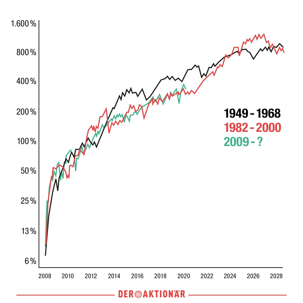 Auffällig: Die Kurve seit der Finanzkrise 2008 ähnelt bislang frappierend denen der großen Bullenmärkte zwischen 1949 bis 1968 und 1982 bis 2000. Sollte sich die Geschichte wiederholen, wären die fetten Jahre noch längst nicht vorbei. Im Gegenteil: Innerhalb des laufenden Jahrzehnts könnte sich der US-Aktienmarkt noch mal verdoppeln!
