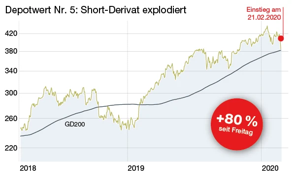 Unter anderem haben wir einen Put-Schein auf einen Weltkonzern aufgenommen, der überaus stark von der Kaufwut chinesischer Touristen abhängig ist – Short-Crash-Depotwert Nr. 5. Da aber in Italien neuerdings mehr als 50.000 Menschen unter Quarantäne stehen, könnten in naher Zukunft auch andere Gebiete in Europa zur Sperrzonen erklärt werden.
