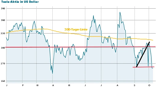 Am Freitag ging die Tesla-Aktie mit 261,95 Dollar aus dem Handel – ein Minus von sieben Prozent. Der Versuch, die 300-Dollar-Marke zurück zu erobern ist damit ein weiteres Mal gescheitert. Durch den Schlusskurs am Freitag durchbricht der Titel auch wichtige Unterstützung im Bereich 263 Dollar. Dort drehte die Aktie im September bereits zweimal nach oben – dieses mal nicht.