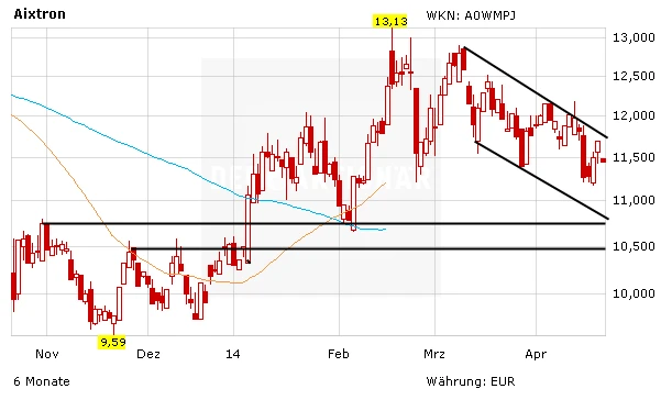 Trotz der schwachen Vorgaben durch Cree – Panik ist nicht angebracht. Wer bei Aixtron investiert ist, sichert sich jedoch mit einem Stopp bei 10,60 Euro ab. Siehe auch „UBS erhöht das Kursziel“.