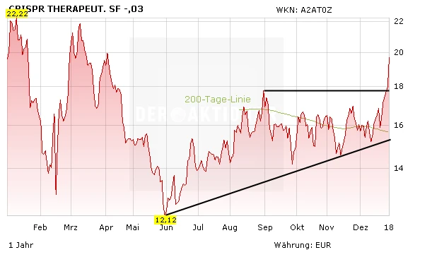 Der Deckel ist geflogen: Am letzten Handelstag des Jahres 2017 hat die Aktie vom Gen-Schere-Spezialisten CRISPR Therapeutics ein neues Rekordhoch markiert und eine mehrmonatige Seitwärtsrange nach oben verlassen. Und das, obwohl sich mit Celgene vor dem Anstieg ein prominenter Großaktionär von einem großen Aktienpaket verabschiedet hat. War die Biotech-Gesellschaft der große Spielverderber? Fakt ist: Das Investoreninteresse am Gen-Schere-Spezialisten wächst kräftig.