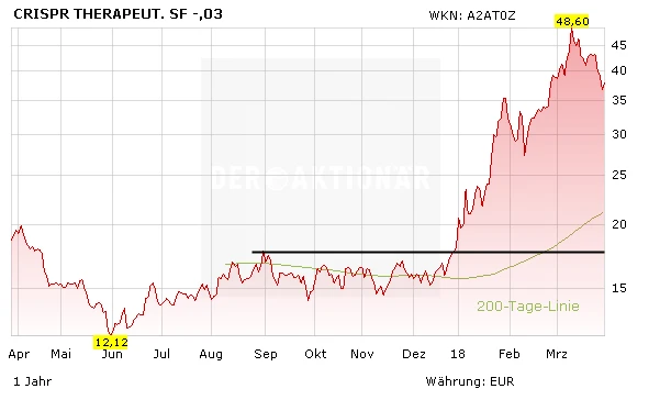Bei Kursen von über 40,00 Euro und rund 160 Prozent Gewinn hat DER AKTIONÄR dazu geraten, einen Teil der Gewinne umzuschichten. Die Bewertung von CRISPR Therapeutics beinhaltet mittlerweile zu viele Vorschusslorbeeren. Wer dennoch auf den spekulativen Gen-Schere-Zug aufspringen möchte, sollte eher einen Fuß bei dem CRISPR-Spezialisten Intellia Therapeutics (WKN A2AG6H) oder beim Zinkfinger-Nukleasen-Favoriten Sangamo (WKN 936386) in die Tür setzen.