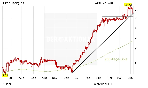 Wenn die politischen Rahmenbedingungen ab 2020 passen, hat CropEnergies Planungssicherheit und kann auf satte Cashreserven für potenzielle Neuinvestitionen zurückgreifen. Die Börse hat die guten Perspektiven längst erkannt und die CropEnergies-Aktie erstmals in zweistellige Kursregionen befördert. Rund 900 Millionen Euro beträgt die Börsenbewertung der Südzucker-Tochter – langfristig erscheint damit sogar eine Aufnahme in den TecDAX möglich.