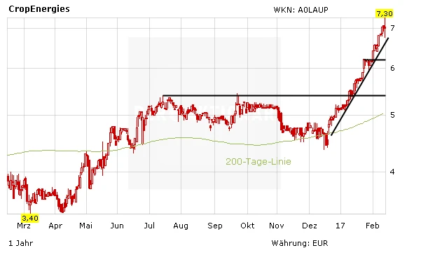 Auch beim Umsatz schraubt CropEnergies die Erwartungen von 760 bis 790 Millionen Euro auf 800 bis 810 Millionen Euro nach oben. In einer ersten Reaktion stieg die Aktie auf ein neues Mehrjahreshoch. Aufgrund des konservativen Ausblicks setzten allerdings kurze Zeit später Gewinnmitnahmen ein.