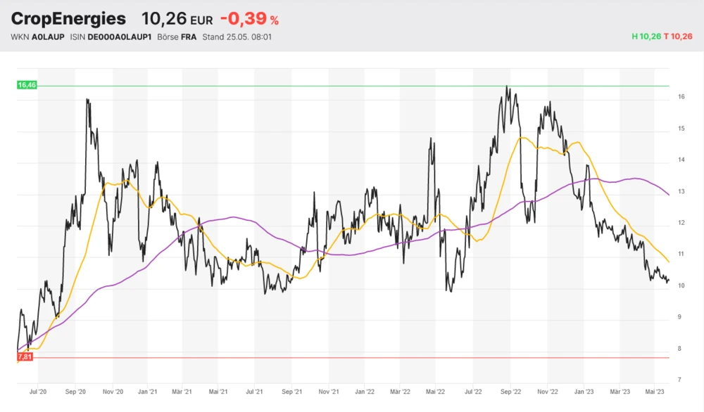 Die am Mittwoch vorgelegten Unternehmenszahlen der Südzucker-Tochter CropEnergies machen Mut und könnten der Beginn einer Trendwende bei der zuletzt stark gebeutelten Aktie sein. Der Konzern steigerte den Umsatz im Vergleich zum Vorjahreszeitraum um 35 Prozent und erzielte damit einen Rekordumsatz von 1,49 Milliarden Euro für das Geschäftsjahr 2022/23. Das Ergebnis vor Zinsen und Abschreibungen wurde von 169 Millionen Euro auf 294 Millionen gesteigert, das operative Ergebnis verbesserte sich von 127 Millionen auf 251 Millionen Euro.