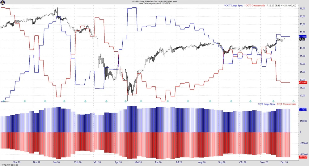 Die Commitments-of-Traders Daten zeigen, dass die Produzenten in den letzten Wochen mit einem steigenden Ölpreis auch ihre Short-Positionen wieder leicht auf -559.995 Kontrakte erhöhten.