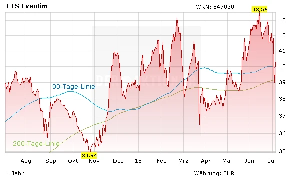 Mit der Herabstufung von „Neutral“ auf „Reduce“ sowie ein um zwei Euro gesenkten Kursziel von 39,50 Euro auf 37,50 Euro, verursachten der negative Analystenkommentar der Equinet Bank sowie eine Abstufung der Baader Bank einen satten Kursabschlag. CTS Eventim repräsentierte somit am Dienstag das Schlusslicht des MDax.