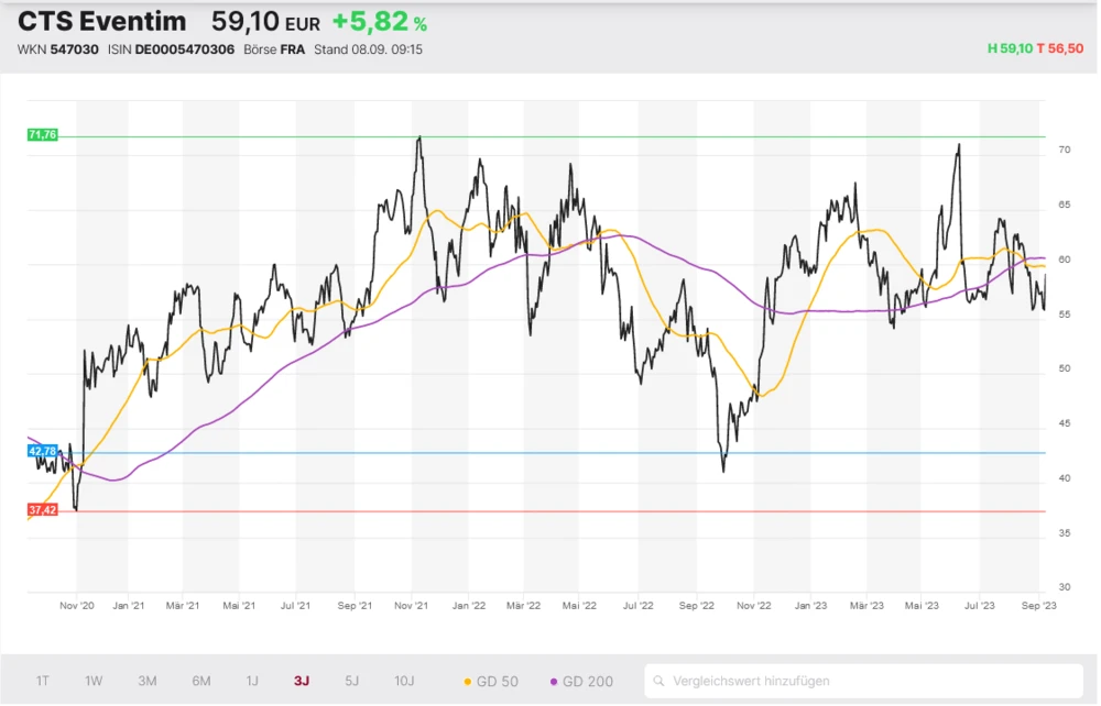 Seit dem Ende der Pandemie ging es bei der Aktie wieder steil bergauf und notiert aktuell auf dem Niveau vor Corona. Der wichtige Support bei 55 Euro hat zuletzt gehalten. Anleger sollten bei dem Unternehmen eher an der Seitenlinie bleiben, im Eventbereich bevorzugt DER AKTIONÄR das amerikanische Unternehmen Live Nation.
