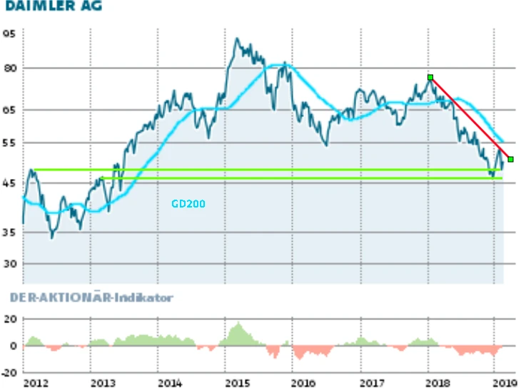 Eher nicht. Die Unsicherheit ist groß und Daimler hat in punkto Elektromobilität viel Zeit verstreichen lassen. An die hohe Taktfrequenz, die Volksagen Chef-Herbert Diess derzeit an den Tag legt, kommt Daimler im Ansatz nicht heran. Ohnehin sieht der Daimler-Chart nach wie vor angeschlagen aus. Ein Kaufsignal würde sich erst ergeben, wenn das Papier den seit einem Jahr anhaltenden Abwärtstrend bei 52,90 Euro nach oben verlässt.