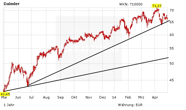 DER AKTIONÄR bleibt weiterhin optimistisch für die Daimler-Aktie. Der Aufwärtstrend ist nach wie vor voll intakt. Langfristig bleibt die Aktie aussichtsreich. An schwachen Tagen ist der Wert durchaus einen Kauf wert. Das Kursziel lautet 75 Euro. Bereits investiert Anleger sichern ihre Position mit einem Stopp bei 57 Euro ab.